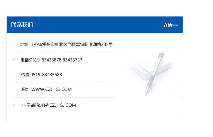 地址:常州市新北區友邦商務大廈1幢16、17層  電話:0519-85101652  傳真:0519-85112595  郵編:213022  網址:www.cz-jiayue_cn.wzhsgy.com  郵箱:xiajifengaa@163.com